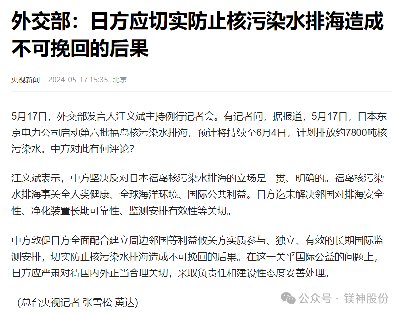 長期以來,這些企業(yè)采用“海水法”以海水中的鎂成分為主要原料,制造銷售鎂鹽產品。而鎂鹽在工業(yè)中廣泛應用,如樹脂穩(wěn)定劑和阻燃劑等工業(yè)用產品、抑酸劑和功能性輔料等醫(yī)藥、食品用產品。這些產品作為環(huán)境友好、安全性高的產品在國內外廣泛使用。然而,日本自核污水排海后已發(fā)生多起“因食用當?shù)睾ur引起食物中毒”、“當?shù)睾┥铣霈F(xiàn)大量異常死亡海鮮”類似事件,同樣是來自于海水的日本鎂鹽其對人類的危害程度可想而知。